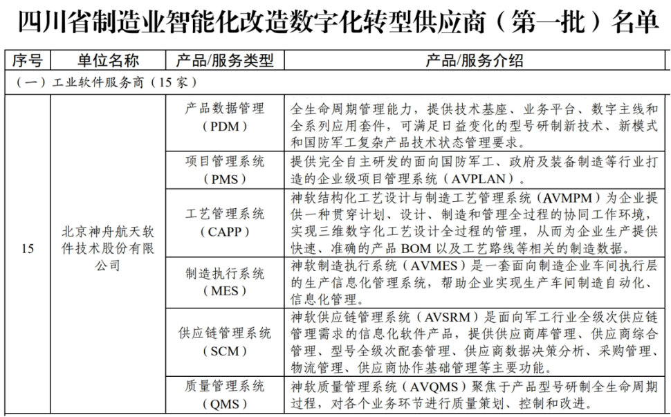 首批供應商的遴選條件,主要包括企業(yè)營(yíng)收規模、專(zhuān)業(yè)資質(zhì)、屬地化服務(wù)能力、產(chǎn)品或服務(wù)領(lǐng)先性等基本條件,同時(shí)要求近三年獲得過(guò)國家級試點(diǎn)示范相關(guān)榮譽(yù),并在制造領(lǐng)域已有一批成功實(shí)踐案例。經(jīng)過(guò)企業(yè)申報、審核推薦、形式審查、意見(jiàn)征求等程序,神軟公司憑借自研的產(chǎn)品數據管理系統PDM,項目管理系統PMS、工藝管理系統CAPP、制造執行系統MES、供應鏈管理系統SCM、質(zhì)量管理系統QMS等工業(yè)軟件產(chǎn)品成功入選。