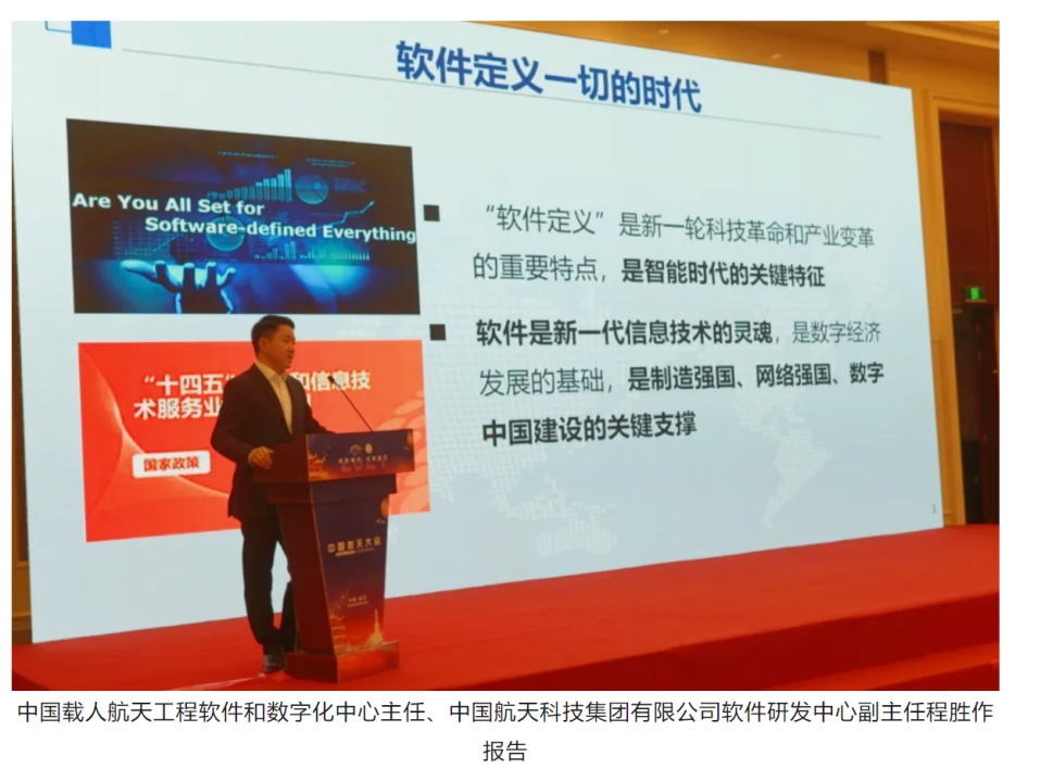 中國載人航天工程軟件和數字化中心主任、中國航天科技集團有限公司軟件研發(fā)中心副主任程勝作題為《構建航天軟件研制新體系——打造航天軟件新質(zhì)生產(chǎn)力》的報告。闡述了國內外軟件行業(yè)發(fā)展概況以及我國航天軟件面臨的嚴峻形勢和挑戰,提出了建立智能時(shí)代航天軟件研制新體系的戰略規劃和體系規劃。
