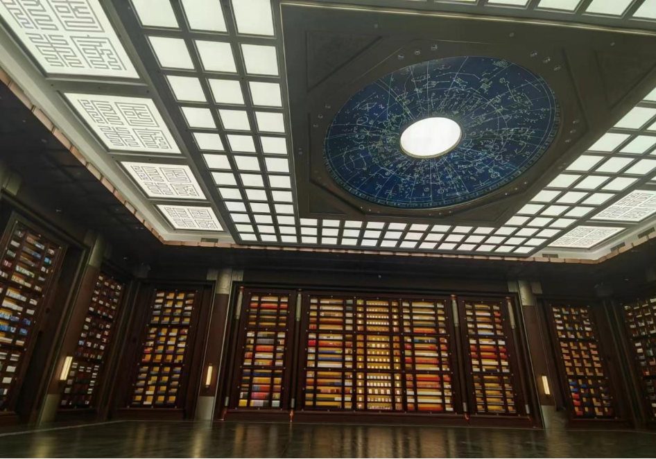在主建筑文華堂,穹頂之上,取自宋代石刻天文圖的滿(mǎn)天星宿點(diǎn)綴其中,寓意中華文明如星空般浩瀚璀璨。環(huán)視四周,15組書(shū)柜、3萬(wàn)余冊古今經(jīng)典匯成文山字海,彰顯厚重文化底蘊。