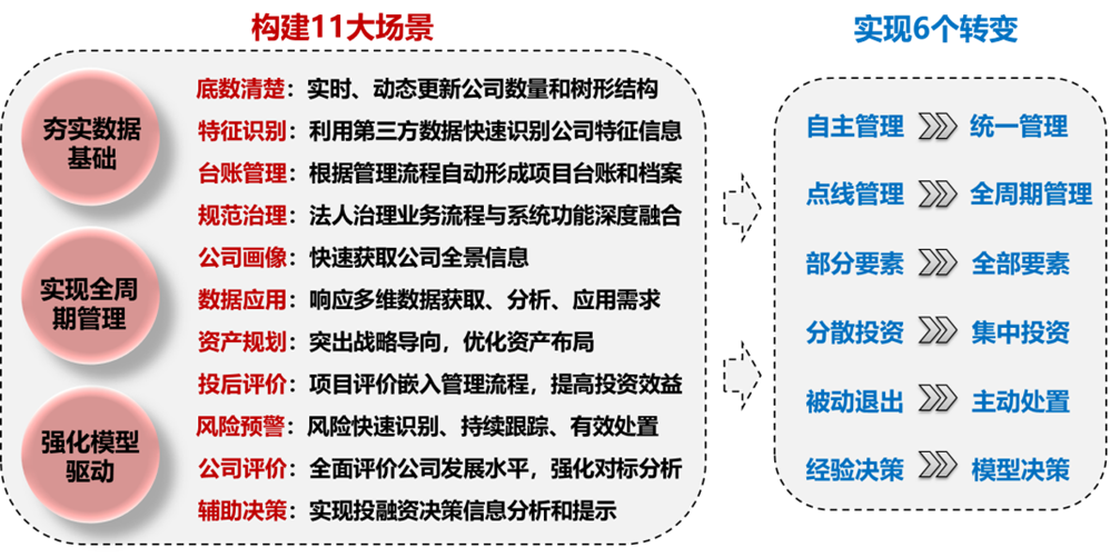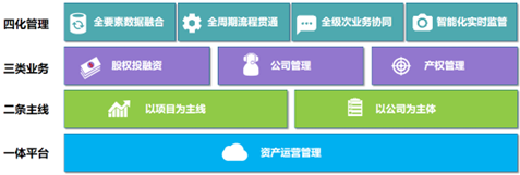 神軟資產(chǎn)運營(yíng)管理系統以投融資項目、公司兩條主線(xiàn)為抓手,圍繞投融資管理、公司管理、產(chǎn)權管理三類(lèi)業(yè)務(wù)進(jìn)行構建。