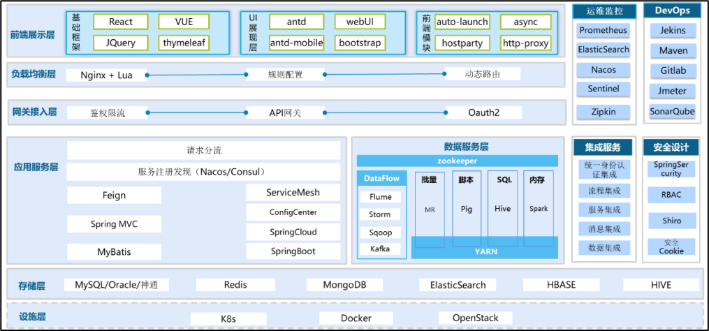 技術(shù)架構:基于A(yíng)SP+微服務(wù)架構,融合低代碼快速開(kāi)發(fā)、容器云平臺等技術(shù)手段,實(shí)現快速開(kāi)發(fā)、迭代、部署等開(kāi)發(fā)運維一體化。