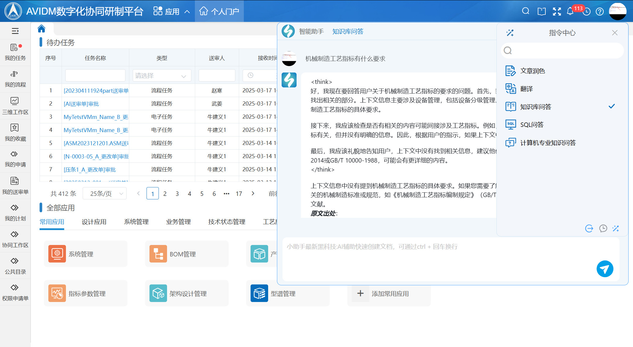 AVPLM系統已具備科研生產(chǎn)智能問(wèn)答、文檔智能生成、文檔智能審查、工藝智能生成等智能化場(chǎng)景應用能力。