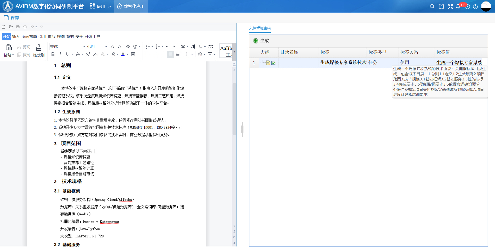 通過(guò)解析文檔模板與設計要求中的關(guān)鍵指標和關(guān)鍵詞,調用DeepSeek大模型進(jìn)行語(yǔ)義分析,可結合科研生產(chǎn)的項目管理、體系論證、系統設計、工藝設計、生產(chǎn)制造、試驗驗證和運維保障業(yè)務(wù)要求,基于歷史文檔庫的相似案例匹配,一鍵生成符合規范的技術(shù)文檔。