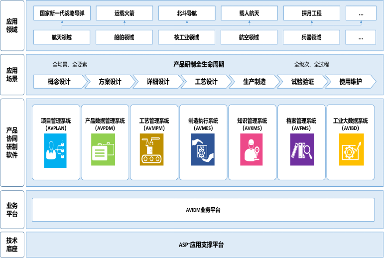 公司憑借在航天及國防軍工等復雜裝備研制信息化領(lǐng)域30余年的積累和實(shí)踐,形成了以AVIDM為品牌的核心工業(yè)軟件產(chǎn)品體系。AVIDM系列軟件主要包括項目管理系統 (AVPLAN)、產(chǎn)品數據管理系統(AVPDM)、工藝管理系統(AVMPM)、制造執行系統(AVMES)、知識管理系統(AVKMS)、數字檔案管理系統(AVFMS)和工業(yè)大數據系統(AVIBD)等子產(chǎn)品。
