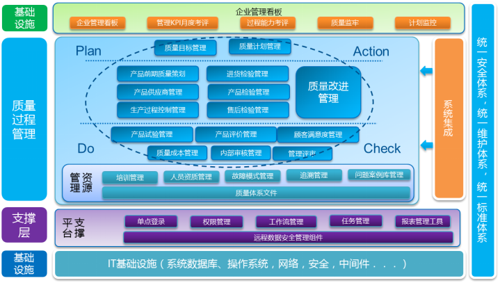 實(shí)現質(zhì)量業(yè)務(wù)流程的有效運行: 通過(guò)基于流程的、電子化及網(wǎng)絡(luò )化的工作平臺,實(shí)現質(zhì)量管理工作的動(dòng)態(tài)協(xié)同,提高質(zhì)量工作的規范性和工作效率,保證質(zhì)量管理體系的充分性、適宜性和持續有效性;實(shí)現質(zhì)量信息的有效整合: 實(shí)現信息化系統之間的無(wú)縫集成,改變質(zhì)量信息被割裂的現狀,消除信息孤島,保證質(zhì)量信息的完整性、關(guān)聯(lián)性和系統性,為質(zhì)量信息的有效應用提供堅實(shí)的保障;實(shí)現質(zhì)量信息的高效應用: 借助信息化的優(yōu)勢,實(shí)現對質(zhì)量數據的全面采集、快速查詢(xún)、多維對分析、準確追溯及靈活打包,充分挖掘數據價(jià)值,實(shí)現質(zhì)量數據應用,保證質(zhì)量管理體系的持續有效性;實(shí)現產(chǎn)品全壽命周期的質(zhì)量控制: 利用計算機技術(shù),協(xié)助設計質(zhì)量、供方質(zhì)量、生產(chǎn)質(zhì)量及售后質(zhì)量管理,實(shí)現質(zhì)量信息的貫通和匯總,過(guò)程及質(zhì)量管理體系的持續改進(jìn)提供堅實(shí)的數據保障;實(shí)現實(shí)時(shí)的質(zhì)量協(xié)同監控和質(zhì)量決策: 通過(guò)質(zhì)量信息在企業(yè)各管理層之間的縱向貫通、傳遞和反饋,為企業(yè)高層領(lǐng)導提供質(zhì)量協(xié)同、監控及決策手段,對影響質(zhì)量的關(guān)鍵因素的判讀及正確質(zhì)量決策的制定。