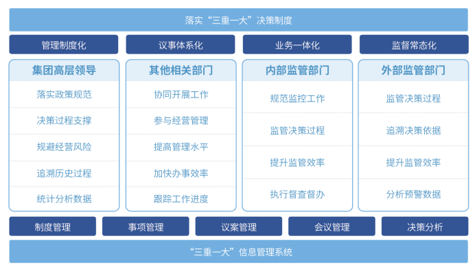 ??神軟針對企業(yè)落實(shí)“三重一大”所面臨的挑戰,助力企業(yè)構建集團及各級法人單位全級次的“三重一大”決策運行管理系統,通過(guò)全景監控、全程跟蹤,全面信息反饋和全部痕跡保留支撐企業(yè)切實(shí)將“三重一大”落實(shí)到實(shí)處。針對不同類(lèi)型用戶(hù)提供個(gè)性化、定制化的功能和服務(wù),滿(mǎn)足外部監管要求與內部管理要求,從而使公司治理規范化、管理制度化、監督常態(tài)化,建立健全“三重一大”科學(xué)決策、高效執行、有效監督的工作體制和機制,防范決策風(fēng)險。